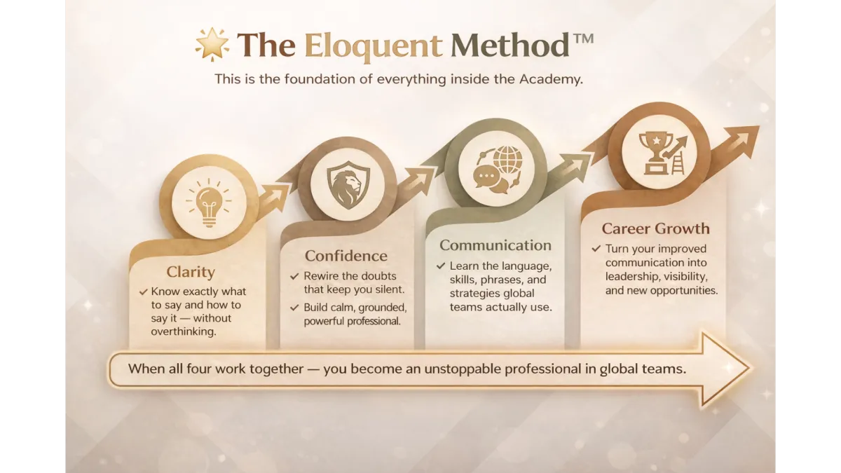 Inside the Academy, I give you everything you need — and nothing you don’t — to communicate powerfully and grow professionally, even if English isn’t your first language.